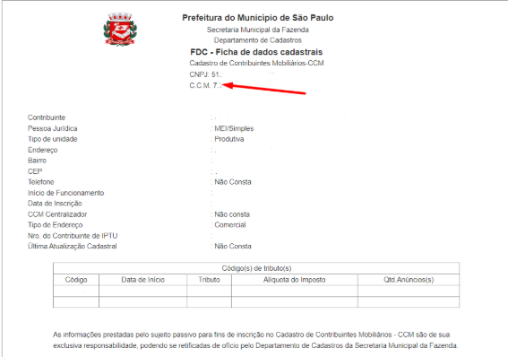 4. O sistema retornará os dados do contribuinte. O código da Inscrição Municipal aparecerá como C.C.M.