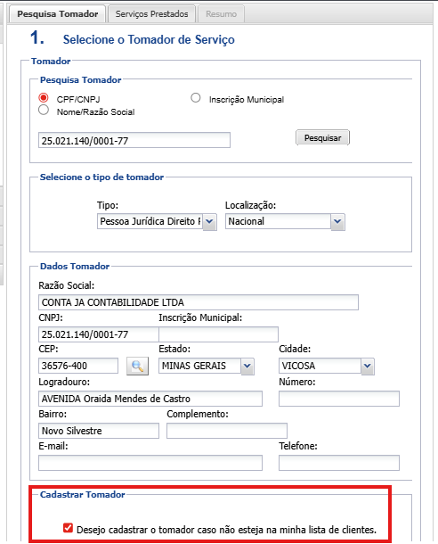 Ao acessar a tela de emissão, o primeiro passo é preencher os dados do tomador do serviço.