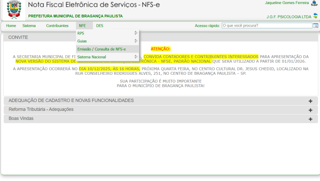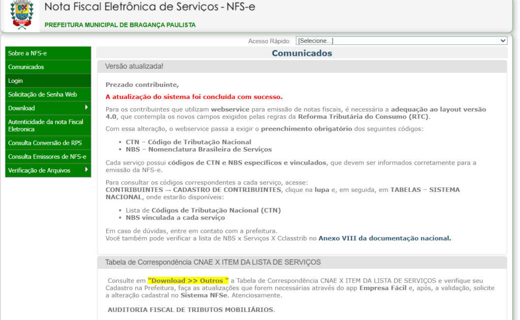 Emitir nota fiscal em Bragança Paulista (SP) exige acesso ao sistema da prefeitura e preenchimento correto dos dados do serviço, tomador e tributação. Em 2026, com a evolução da Reforma Tributária, campos como NBS e classificação do serviço passaram a impactar diretamente a consistência fiscal da empresa.