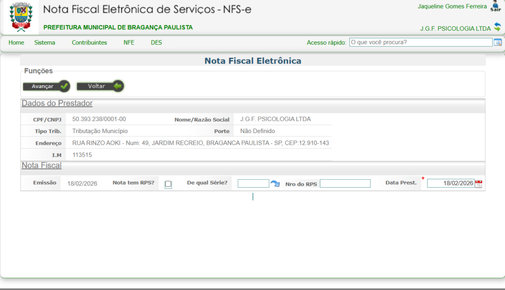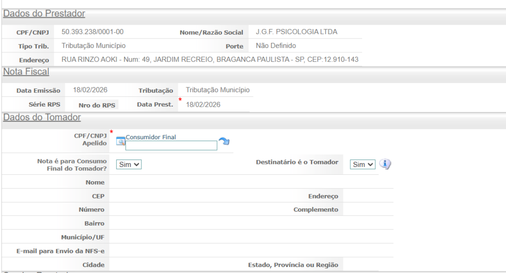 O sistema exibirá os dados do prestador já preenchidos automaticamente.