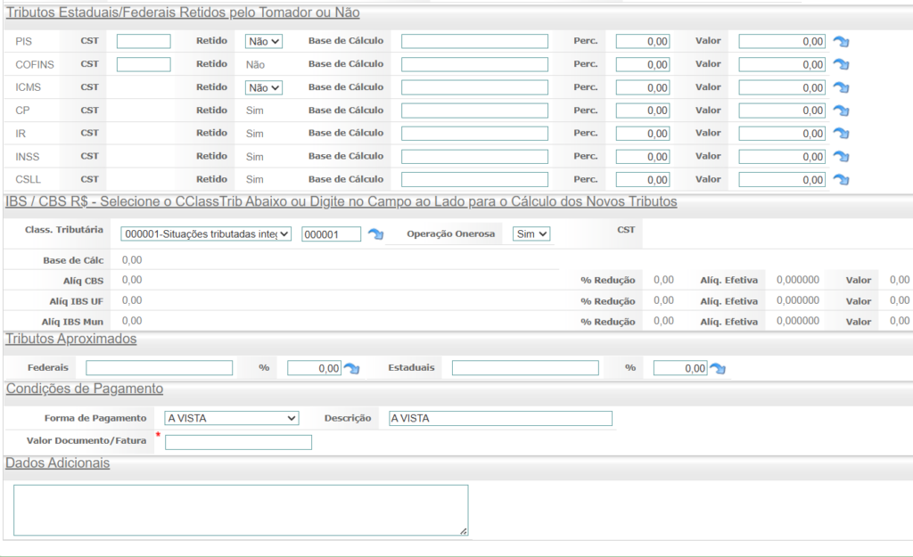 Informar valores e tributação