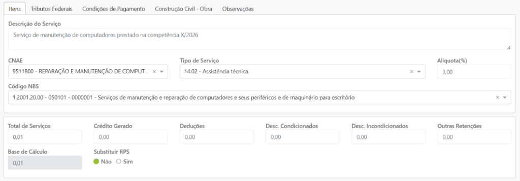 O código NBS deve refletir exatamente o serviço executado. Caso tenha dúvida, consulte antes de finalizar: