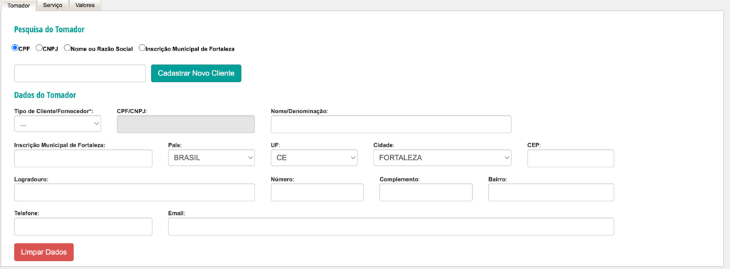 Se o tomador for CPF, informe “Física”, caso seja uma empresa o seu cliente, informe “Jurídica” depois informe os dados cadastrais do seu cliente. (CPF/CNPJ, Endereço, E-mail).