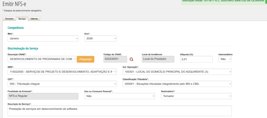 - Tomador estrangeiro: Ao selecionar um tomador do exterior, o sistema solicitará informações adicionais, como o país de origem e o CNPJ ou CPF do tomador internacional (caso aplicável). Para serviços prestados ao exterior, é importante atentar para a isenção de ISS conforme a legislação vigente.