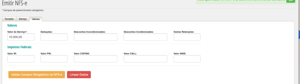 Antes de emitir a NF, clique em “Visualizar Nota” para revisar os dados. Estando tudo correto, clique em “Validar campos obrigatórios da NFS-e”