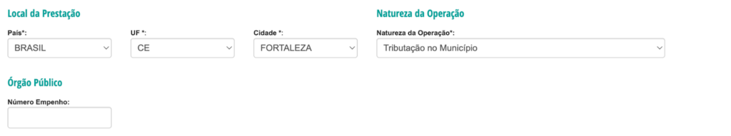 Em “Local da prestação” você deve colocar o País, UF, Cidade e Natureza da Operação