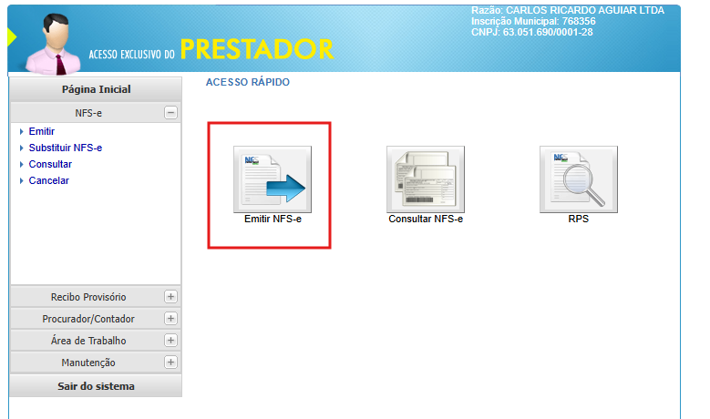 - No menu Acesso rápido, clique em Emitir NFS-e