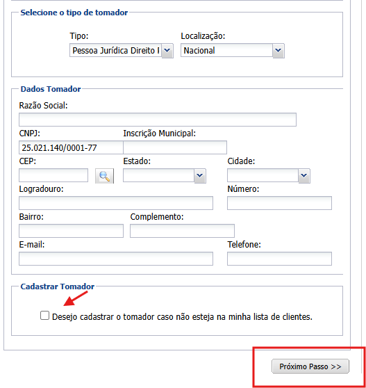 - Marque a opção “Desejo cadastrar o tomador caso não esteja na minha lista de clientes”