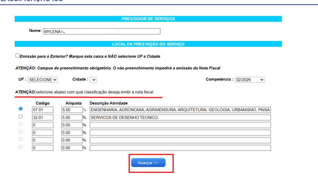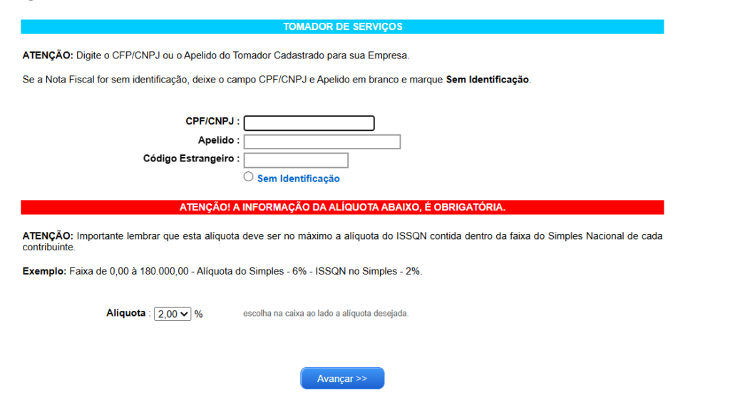 Após o preenchimento, informe a alíquota de ISS e clique em Avançar.