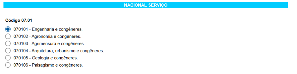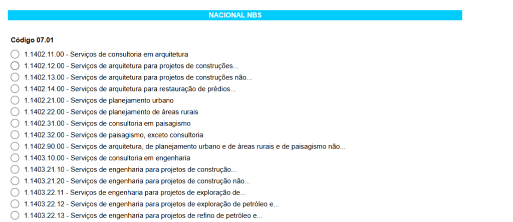 O NBS deve estar alinhado ao código de serviço selecionado. Para facilitar a escolha correta, consulte antes de finalizar:
