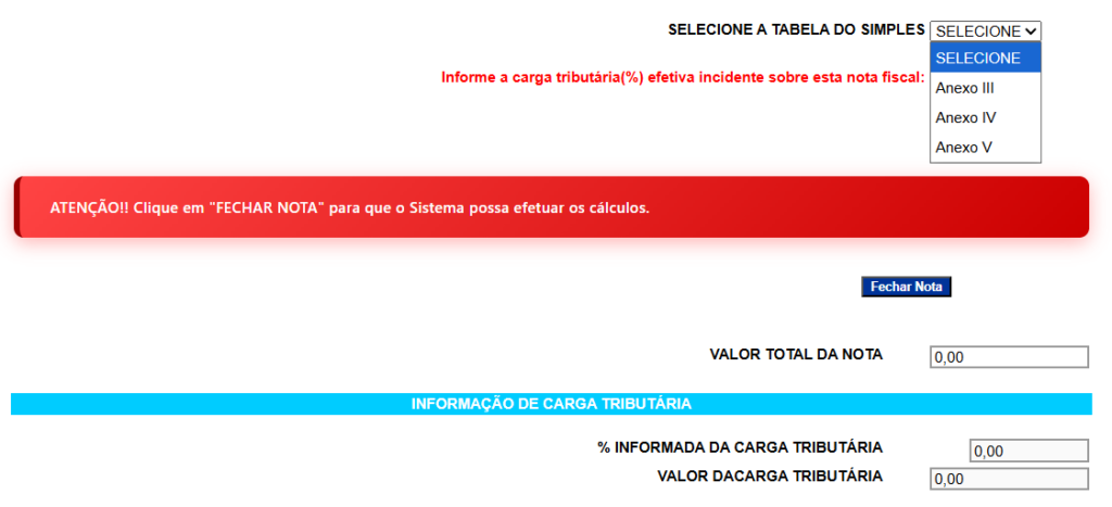 Depois, selecione a tabela do Simples Nacional correspondente (Anexo III, IV ou V, conforme o caso) e clique em Fechar Nota.
