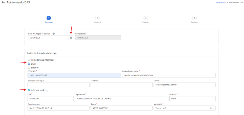 5. Informe a data da prestação e os dados do tomador