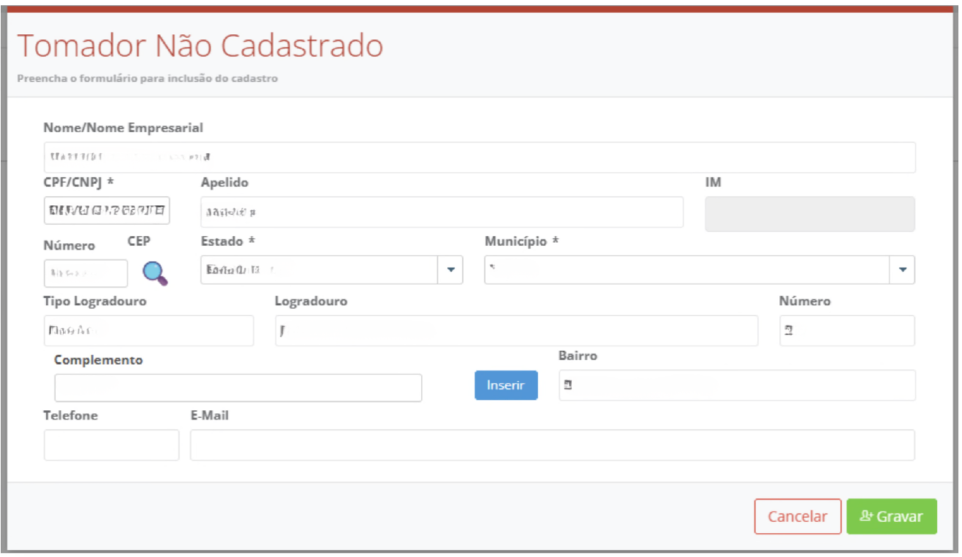 Para o caso de o Tomador não está cadastrado, preencher a tela que vai abrir com os dados do cliente e clicar em “Gravar”: