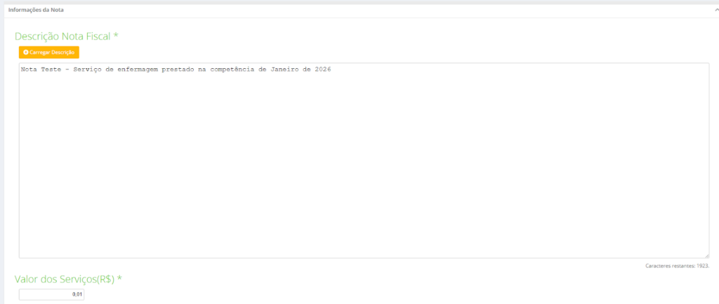 Descrição da Nota Fiscal: Aqui, detalhe o serviço. Seja claro e objetivo (Ex: “Consultoria em Marketing Digital referente ao mês de Janeiro”).