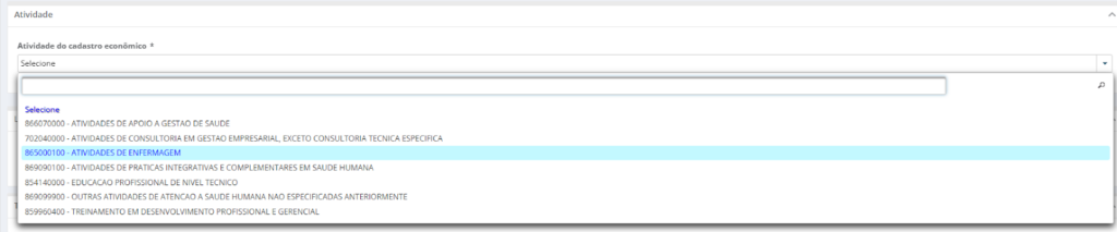 Atividades: Clique na caixa de seleção para abrir a lista de serviços permitidos no seu CNPJ. Selecione a opção exata referente ao serviço prestado.