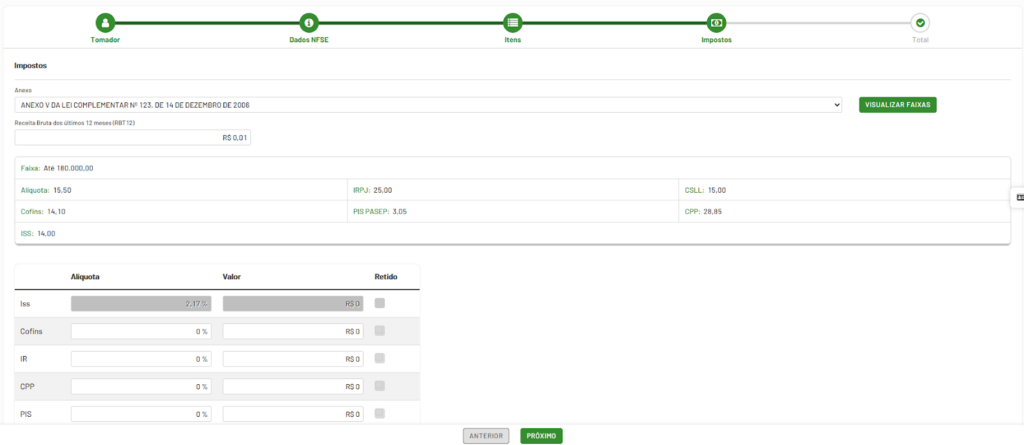 Preencha a aba de impostos