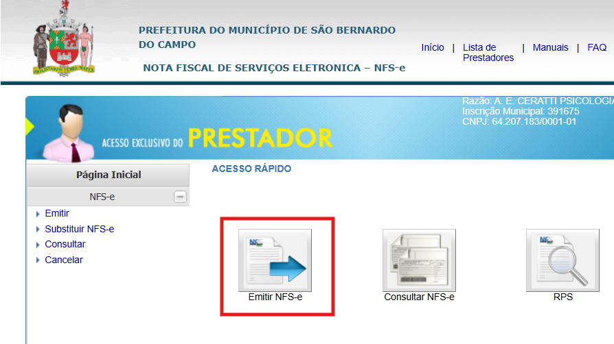 Após acessar o ambiente do prestador, clique em Emitir NFS-e.
