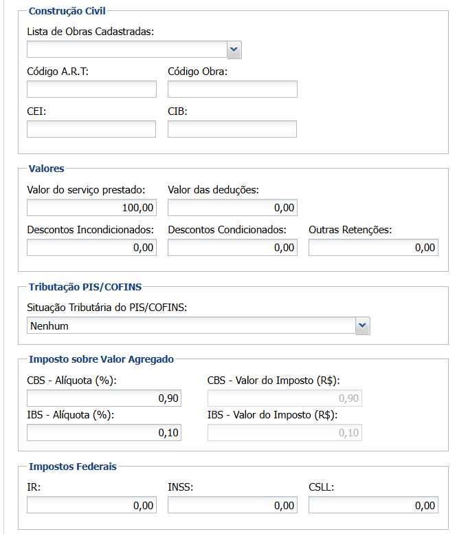 Os valores de retenções federais devem permanecer zerados, salvo orientação específica do tomador.