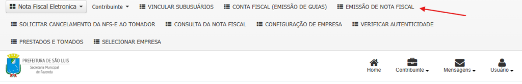 - Em seguida, no menu superior, clique em Emissão de Nota Fiscal