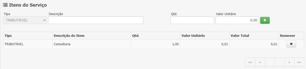 É necessário preencher o campo “Descrição da Nota”. Para isso, basta informar um detalhamento da prestação de serviço, juntamente com a adição do item, onde deve se informar uma descrição, a quantidade e o valor.